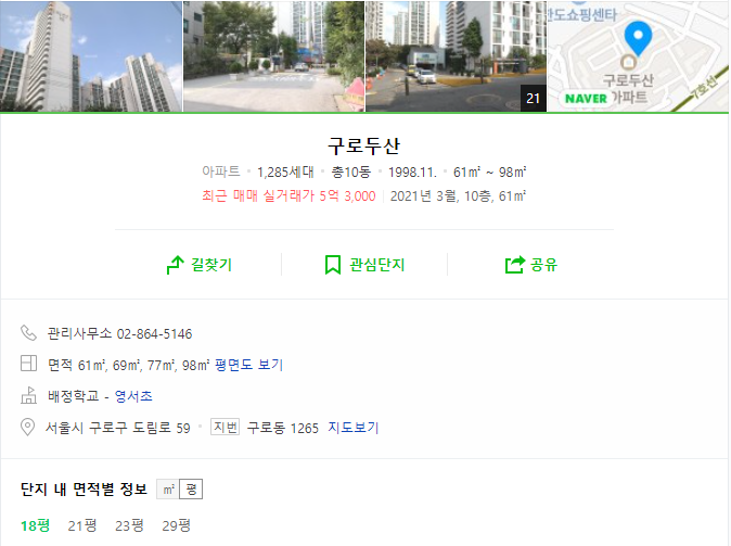 구로두산 아파트 면적의 경우 네이버 기준 18평, 21평, 23평, 29평으로 구성되어 있습니다.