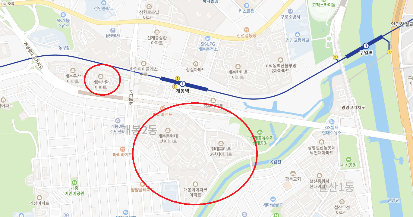 개봉역 아래쪽에 있는 개봉동현대1차 아파트나 현대홈타운 2단지 아파트 등