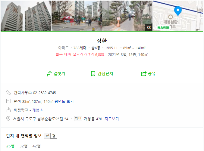 개봉 삼환아파트 평수의 경우 네이버 기준으로 25평, 32평, 42평형으로 구분되어 있습니다.