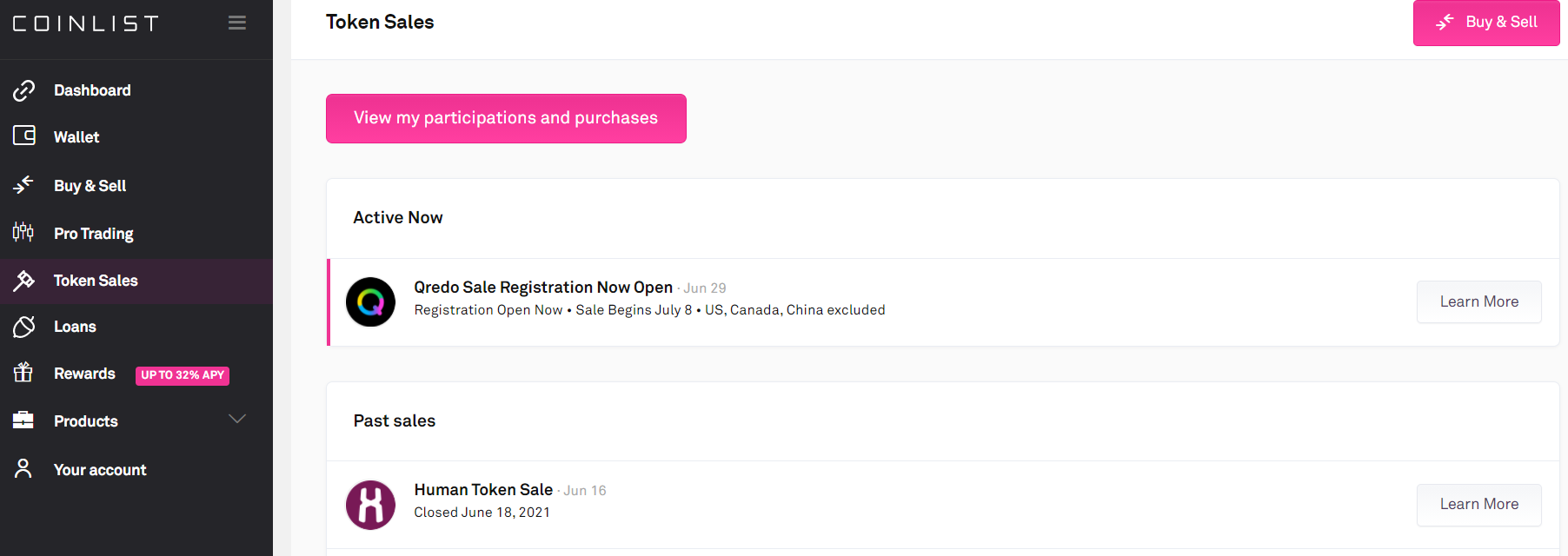 1. coinlist.co 사이트로 들어가서 왼쪽 메뉴 중 [Token Sales]를 클릭합니다.