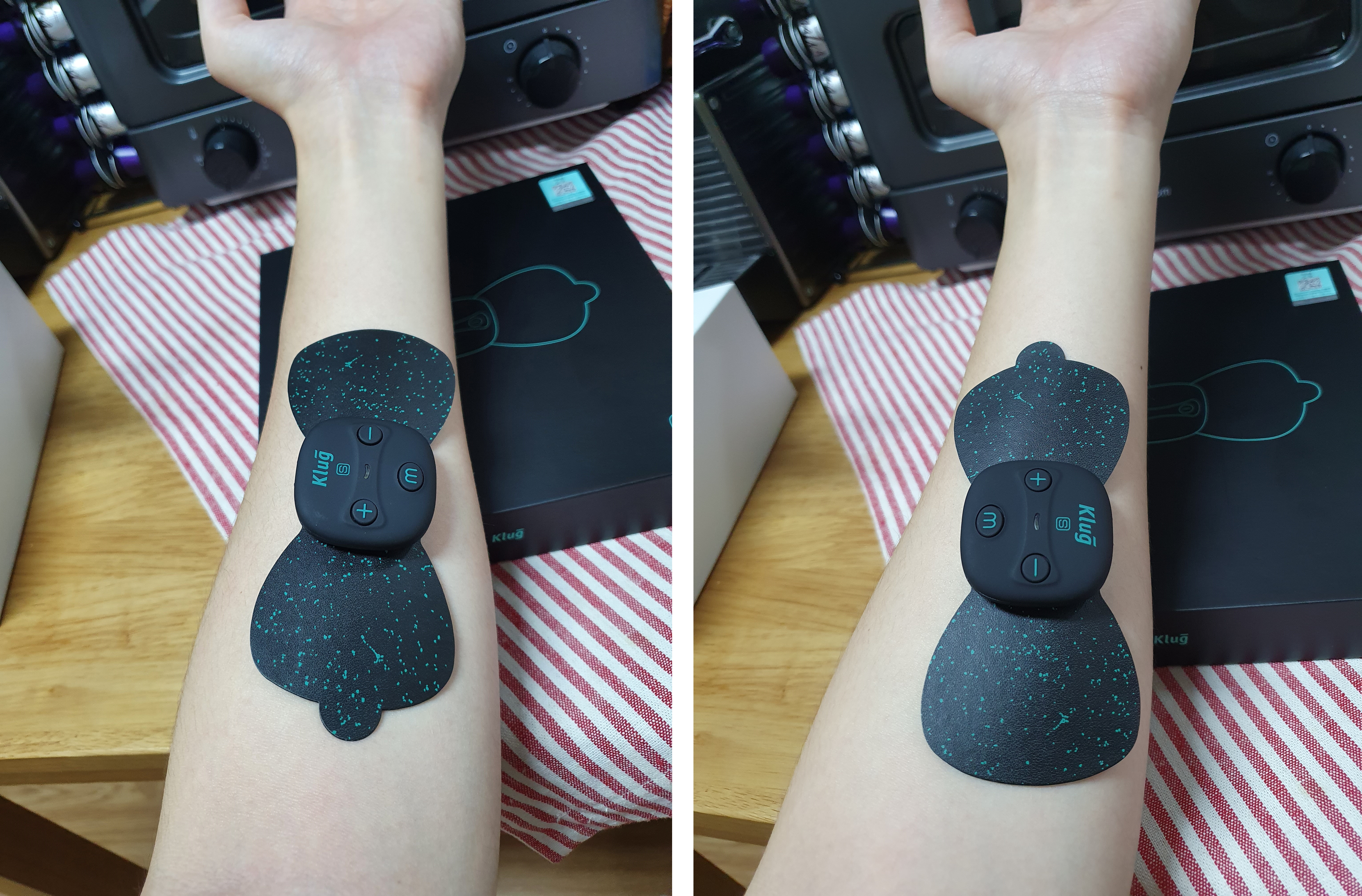 실제 제 팔에 작은 사이즈인 기본 패드를 부착한 모습입니다.
