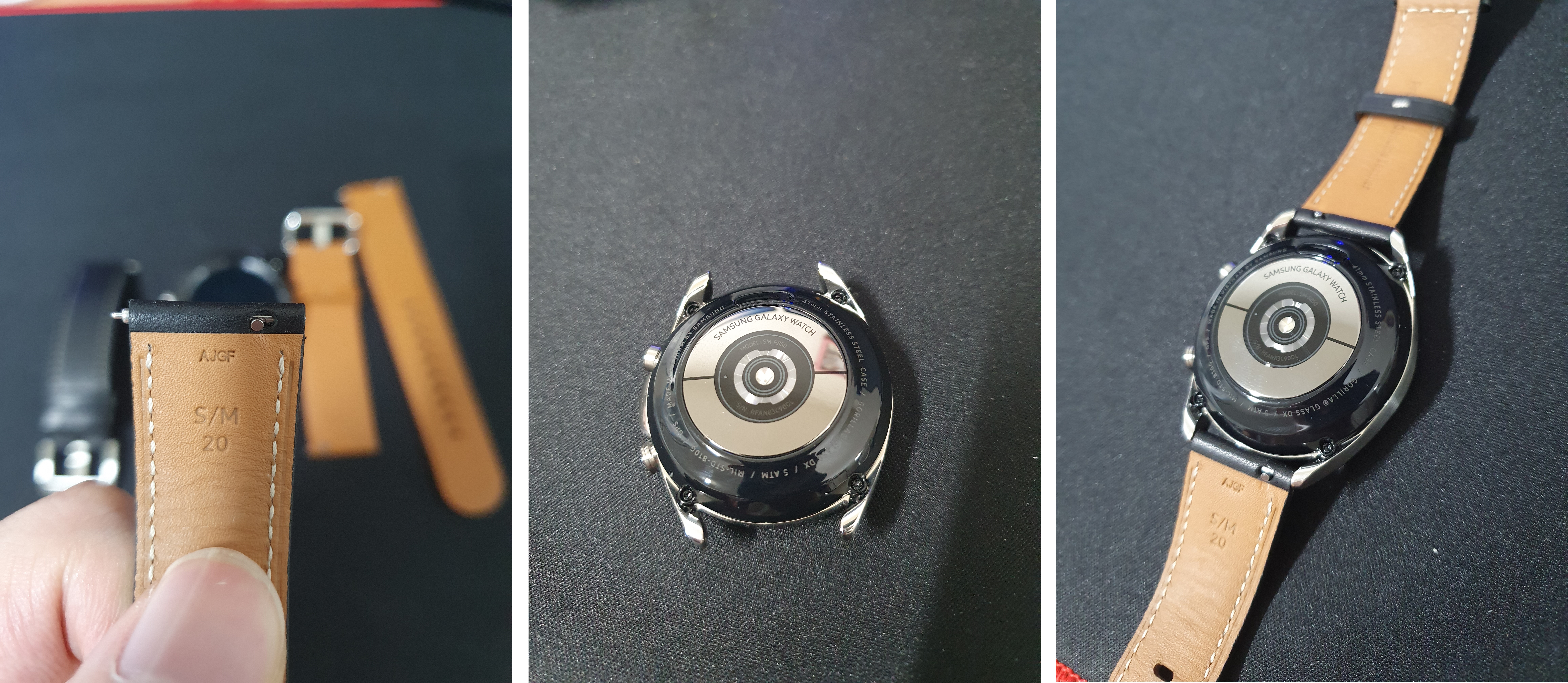 갤럭시 워치3는 스트랩 교체가 굉장히 간단하고 직관적입니다. 가장 왼편 사진에서 볼 수 있듯이 워치 본체에 한쪽 고리를 미리 끼운 후 후크를 당겨서 반대쪽 고리를 끼운 후 후크를 놓으면 착 하고 끼워집니다.