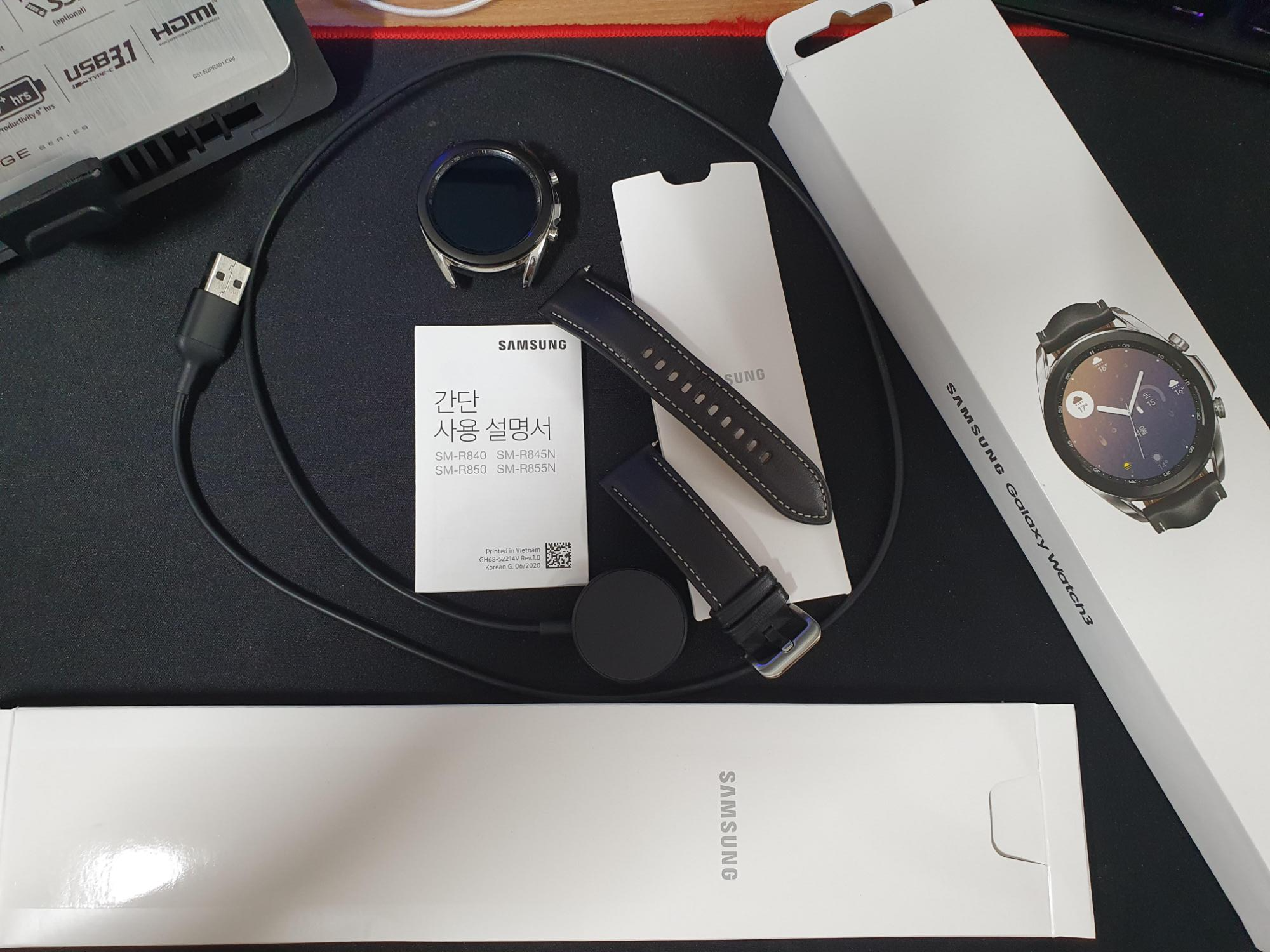 갤럭시 워치3의 구성품은 위에 나와있 듯이 충전 케이블, 워치 본체, 스트랩, 설명서 등이 포함되어 있습니다. 충전 어댑터는 포함되어 있지 않습니다.