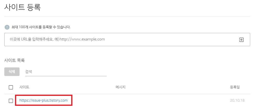 사이트 등록하는 공간에 자신의 티스토리 블로그 주소를 입력한 후 우측에 있는 버튼을 클릭합니다.