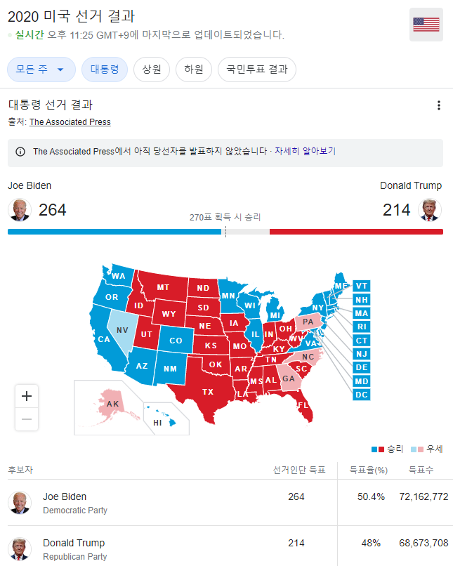 그렇기 때문에 미국 대선이 되면 실시간 개표 사이트나 뉴스 기사에 '270표'라는 단어가 자주 언급되는 것입니다.