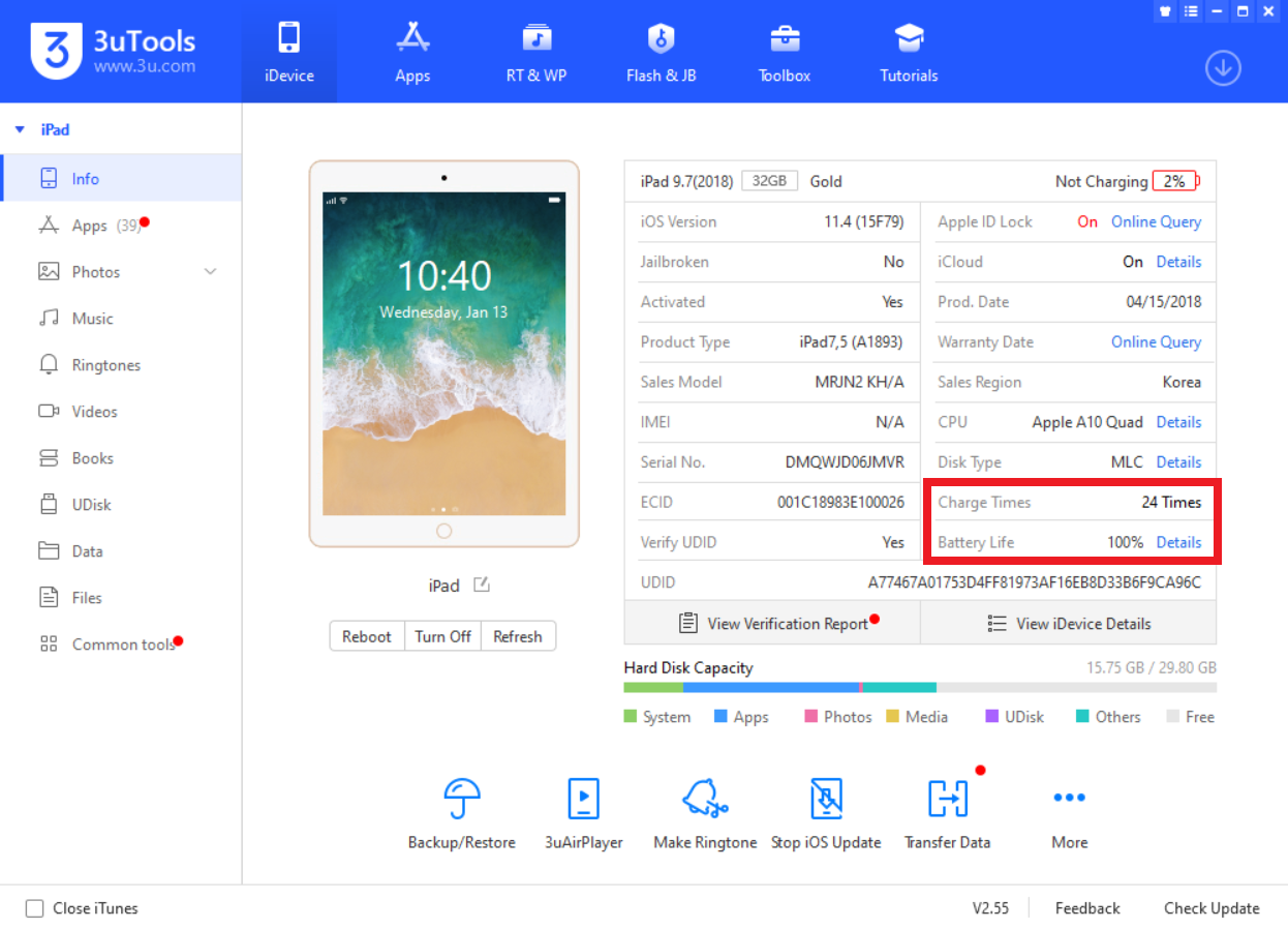 3utools 프로그램에서 아이패드의 모든 정보를 확인할 수 있습니다.