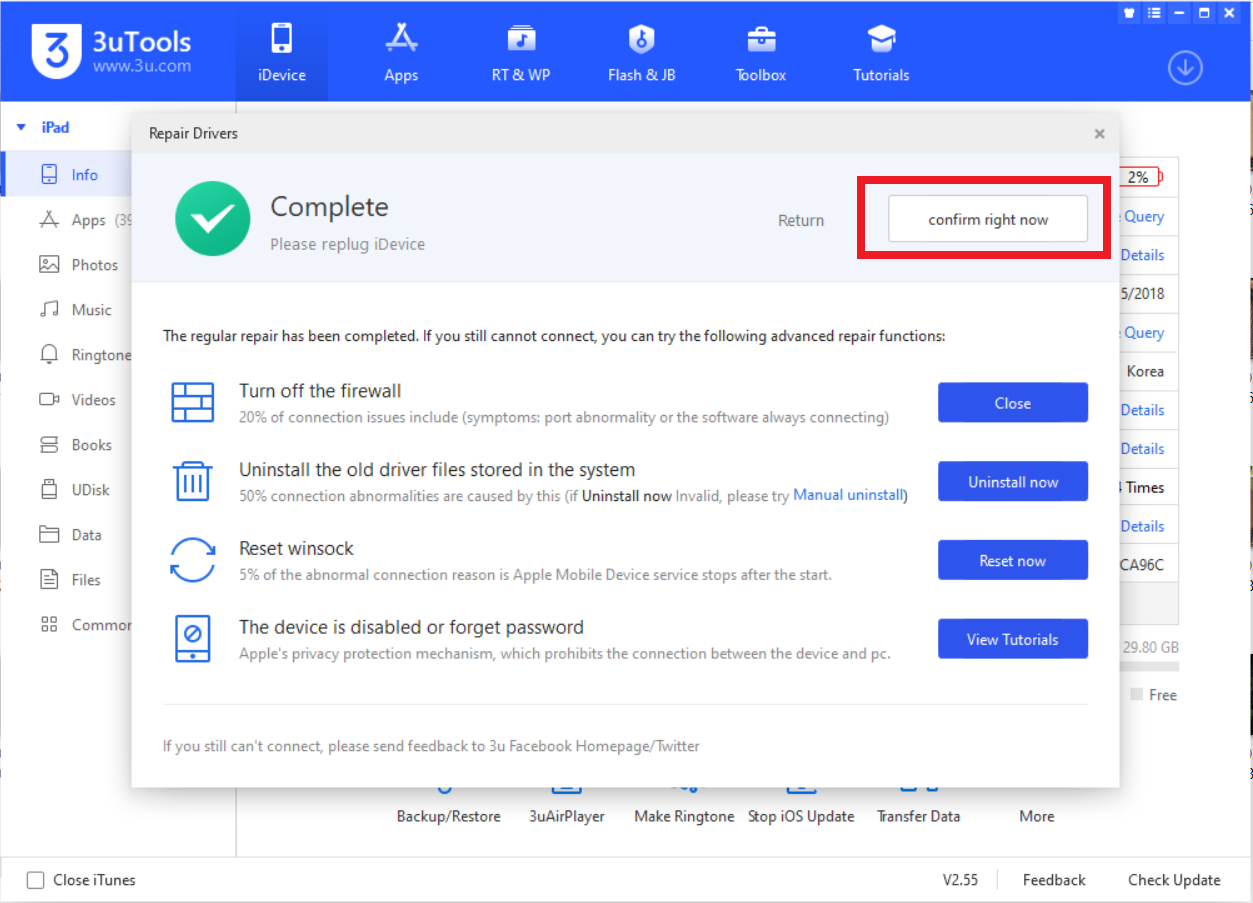 7. 'Repair'가 끝나고 나면 'confirm right now'를 클릭해서 팝업을 꺼줍니다.